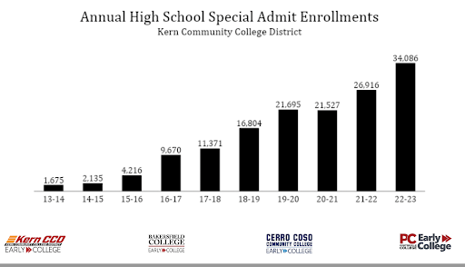 Under the leadership of Kylie Campbell, Director of Outreach Services and Early College for the Kern Community College District, the Get Focused…Stay Focused!® program initiated at Bakersfield College in 2016, has evolved to an institutionalized strategy for student success. In the last seven years, since the district pioneered the Get Focused…Stay Focused!® program starting in the ninth grade, the results in growth of dual enrollment have been phenomenal as the graph below shows––from serving 4,216 students to 34,086 students.